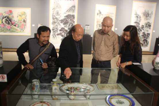 劉致遠(yuǎn)作為國畫、廣彩陶藝大師劉群興之子,也自幼隨父學(xué)習(xí)國畫及陶瓷制作,其廣彩作品色澤鮮明,絢麗多彩,既師吸收統(tǒng)繪畫技法,又仿造西洋畫法,頗具嶺南畫派折衷中西的精髓。其國畫松樹題材的創(chuàng)作,盡顯崇山峻嶺之中,松之勁峭與水之嫵媚,其繪制的山水題材彩瓷既有山河磅礴之態(tài)勢、又具匠心細(xì)刻之精致。此次兩位嶺南畫派傳承人在此展出他們的作品,內(nèi)容、風(fēng)格各異,交相輝映,很好地承傳了嶺南畫派的要義。