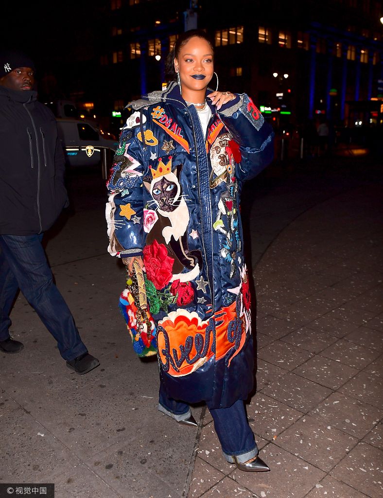 蕾哈娜印花羽絨服色彩斑斕 藍(lán)唇狂野
