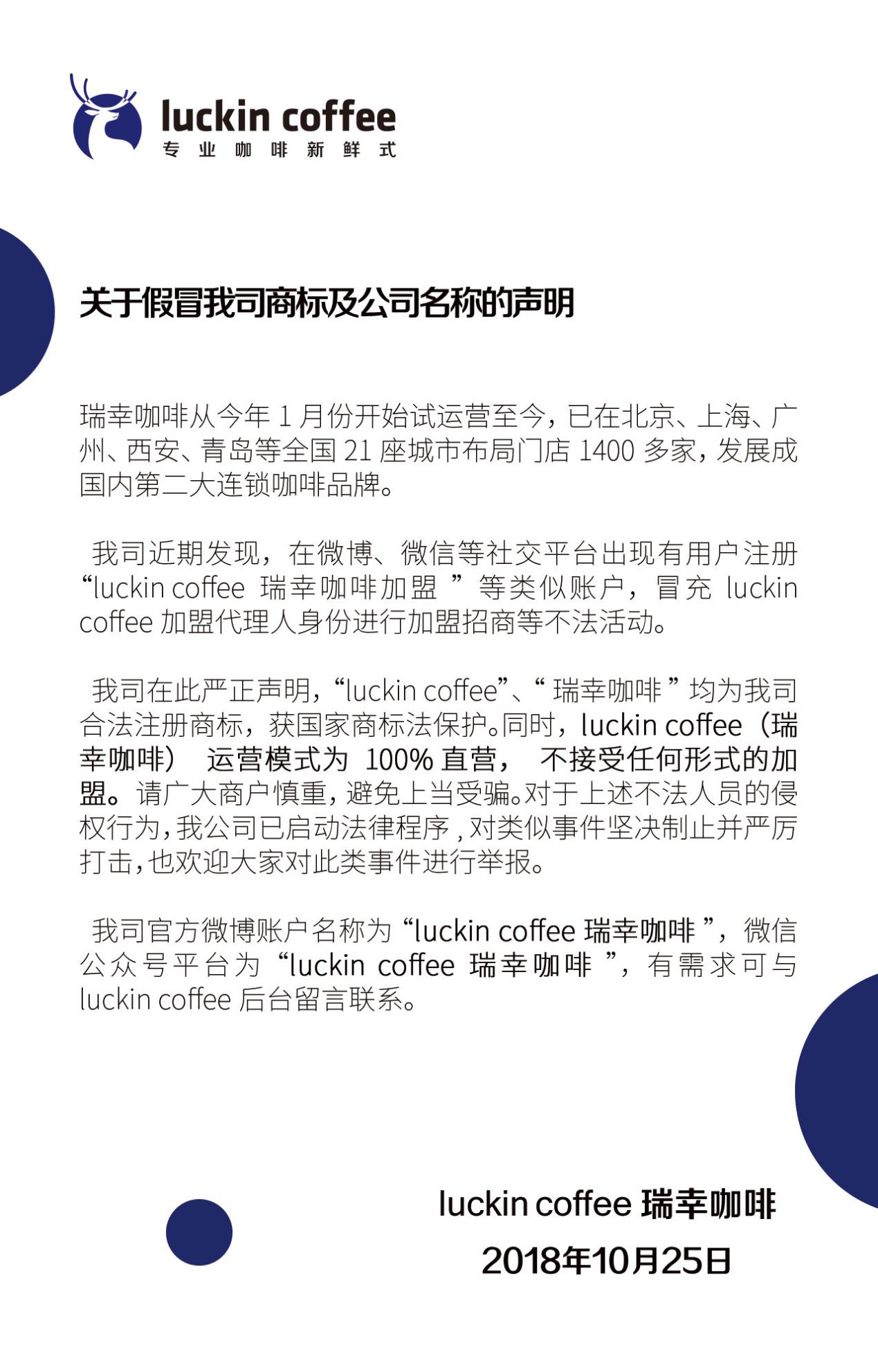 深圳新聞網(wǎng)訊 近日,瑞幸咖啡官宣聲明:我司近期發(fā)現(xiàn),在微博、微信等社交平臺出現(xiàn)有用戶注冊“l(fā)uckin coffee瑞幸咖啡加盟”等類似賬戶,冒充luckin coffee加盟代理人身份進(jìn)行加盟招商等不法活動。luckin coffee瑞幸咖啡堅(jiān)持運(yùn)營模式為100%直營,不接受任何形式的加盟,請廣大商戶慎重,避免上當(dāng)受騙。