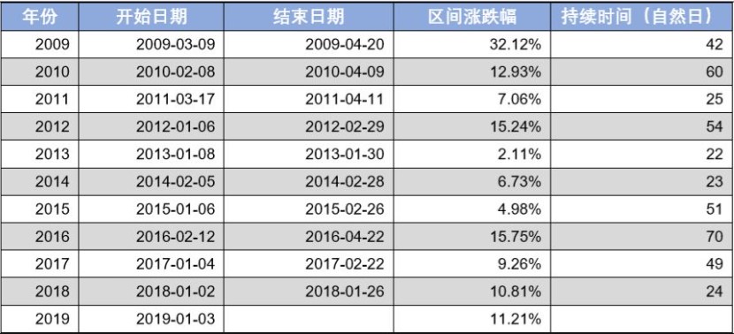 從以上統(tǒng)計(jì)數(shù)據(jù)可以明顯看到春季躁動(dòng)的存在,但是持續(xù)的時(shí)間和區(qū)間漲跌幅有明顯的差異,持續(xù)時(shí)間最短的是2018年,一共24個(gè)自然日,最長(zhǎng)的是2016年達(dá)到70個(gè)自然日。漲幅最小的是2013年,僅僅上漲2.11%,效果最不明顯。