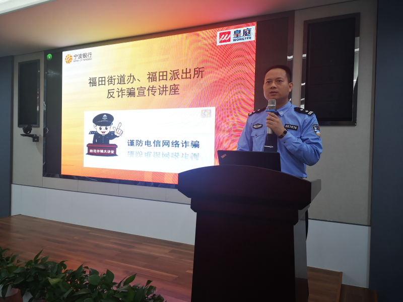 深圳新聞網(wǎng)訊 近年來,信息詐騙案件多發(fā),詐騙分子手段層出不窮,不僅給廣大市民造成了財產(chǎn)損失,更加將社會的反詐騙宣傳教育工作推向重要位置。為了普及廣大金融消費(fèi)者的反詐騙知識,同時讓知識宣傳更接地氣,近日,寧波銀行深圳分行攜手深圳福田街道辦、福田派出所對皇庭中心大廈100多位商戶代表,開展了一場教育意義深刻的反詐騙知識講座。福田區(qū)副所長羅躍、福田派出所社區(qū)隊(duì)隊(duì)長莫予寶、福田街道辦政法辦主任馬建忠、皇庭物業(yè)總經(jīng)理吳海兵、寧波銀行深圳分行監(jiān)察保衛(wèi)部副總經(jīng)理陳久桐等9位警銀領(lǐng)導(dǎo)代表出席了本次活動。