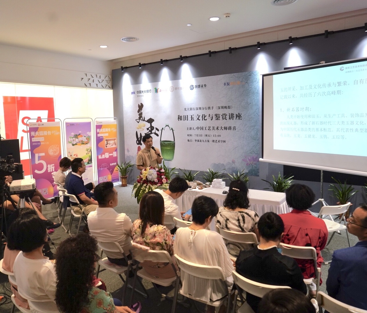 在講座中,蔣喜先生圍繞美玉初探;師古而不擬古——貴在創(chuàng)新等內(nèi)容進(jìn)行了分享,對當(dāng)代玉雕創(chuàng)作中的師古與創(chuàng)新進(jìn)行了深入淺出的講解,讓現(xiàn)場嘉賓獲益匪淺。在講座現(xiàn)場,光大銀行深圳分行的工作人員為到場嘉賓介紹了個人理財(cái)、私行業(yè)務(wù)、出國金融、信用卡業(yè)務(wù)等多個產(chǎn)品業(yè)務(wù),讓聽眾對光大銀行金融產(chǎn)品有了更深入的了解。
