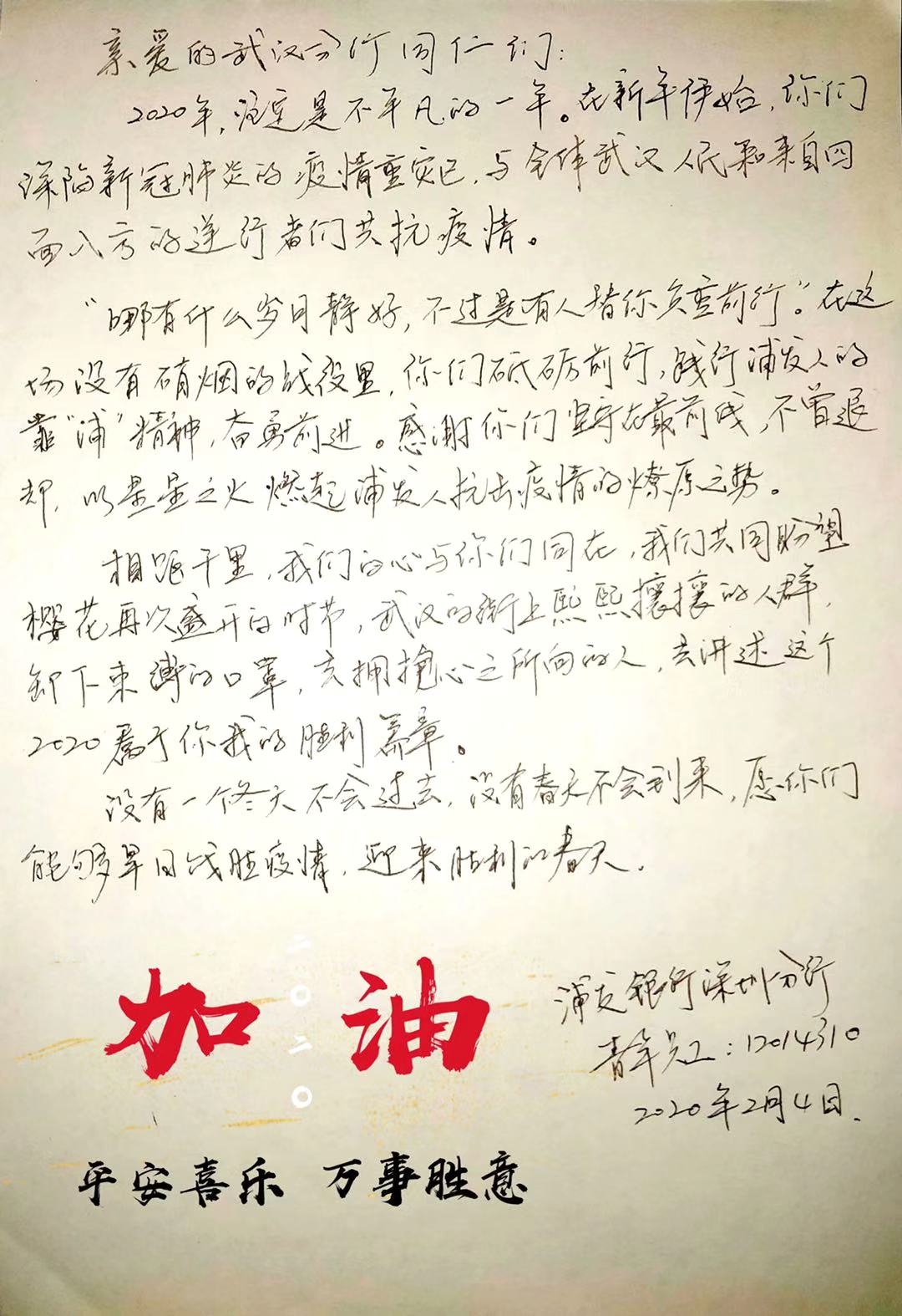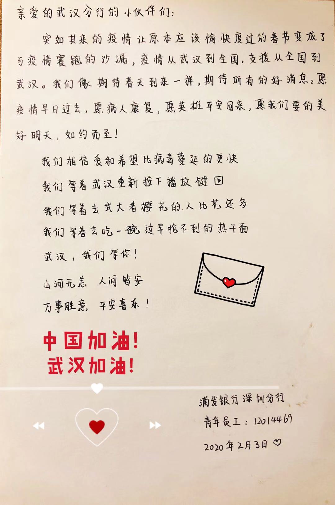 2月3日,浦發(fā)銀行深圳分行團委向全體青年員工發(fā)出了一封倡議書。在倡議書中,該行團委號召廣大團干部、團員青年立即行動,充分發(fā)揮黨的助手和后備軍作用,展現(xiàn)青年突擊隊作為,為堅決打贏疫情防控阻擊戰(zhàn)貢獻力量,并向青年提出三個要求:“堅定信心不迷茫,聽黨指揮勇?lián)敗?、“科學防范不信謠,眾志成城控疫情”、“居家辦公不離崗,服從指揮勇?lián)敗?。當日,浦發(fā)銀行深圳分行發(fā)起了給武漢分行同事寄送家書的活動,該行全體青年手寫家書,圖文并茂、紙短情長,表達了對疫區(qū)“戰(zhàn)友們”最深切的關愛和鼓勵,身體力行做好他們堅強的后盾。