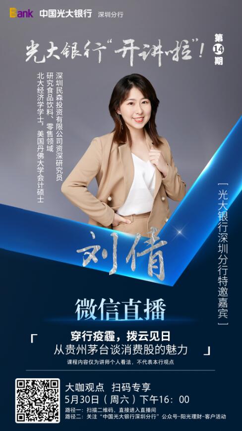此次,光大銀行深圳分行攜手鳳凰深圳財經,邀請到北大經濟學碩士、美國丹佛大學會計碩士、深圳民森投資有限公司資深研究員劉倩女士,在線為客戶帶來《穿行疫霾,拔云見日——從貴州茅臺看消費股的魅力》主題分享。據(jù)悉,劉倩女士關注于食品飲料、零售領域的投資研究。此次分享,她以眾所熟知的茅臺酒為案例,結合A股2000年至2018年漲幅數(shù)據(jù)、茅臺歷史、品牌發(fā)展、銷售渠道、市場占有等多方面,介紹孕育牛股搖籃的消費股投資邏輯,幫助更多客戶在全球受疫情沖擊、經濟不確定時期,了解A股牛股市場邏輯、知曉投資策略提升個人資產。