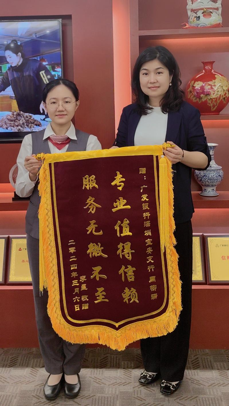 深圳新聞網(wǎng)2024年5月11日訊(記者 朱琳)“真的太感謝廣發(fā)銀行了!要不是廣發(fā)銀行專業(yè)高效的服務,我這筆貨款都不知何時能付出去!”小微企業(yè)主李先生握著廣發(fā)銀行深圳寶安支行服務經(jīng)理周柳珊的手激動地說,隨后將一面印有“服務無微不至,專業(yè)值得信賴”的錦旗送到她的手中,向該行熱情、高效、暖心的服務表示感謝。錦旗上十二個金燦燦的大字寄托了客戶對廣發(fā)銀行沉甸甸的信任和堅定不移的支持。