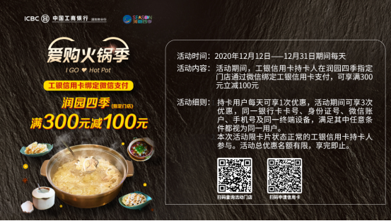 12月31日前每天,微信綁定工銀信用卡在潤(rùn)園四季指定門(mén)店消費(fèi)滿300元減100元!