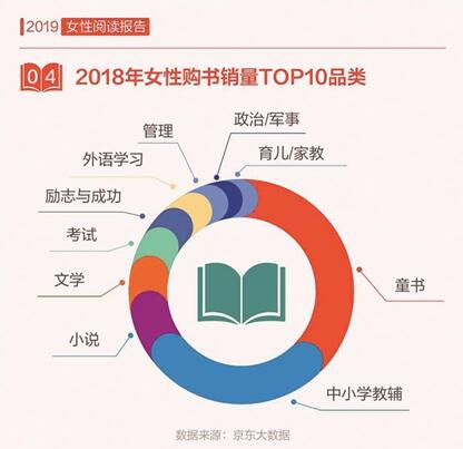 京東大數(shù)據(jù)顯示,女性的讀書量顯著提升,2018年,女性讀者人均購(gòu)書7.6本,高于男性,女性讀者在紙質(zhì)書購(gòu)買上的人均消費(fèi)近230元,女性的“閱讀力”正在變得越來(lái)越強(qiáng)。從圖書銷量上看,2018年女性讀者購(gòu)買最多的圖書是童書、中小學(xué)教輔、小說(shuō)、文學(xué)和考試,可見對(duì)于大部分女性而言,購(gòu)書的主要目的是出于育兒的需求。