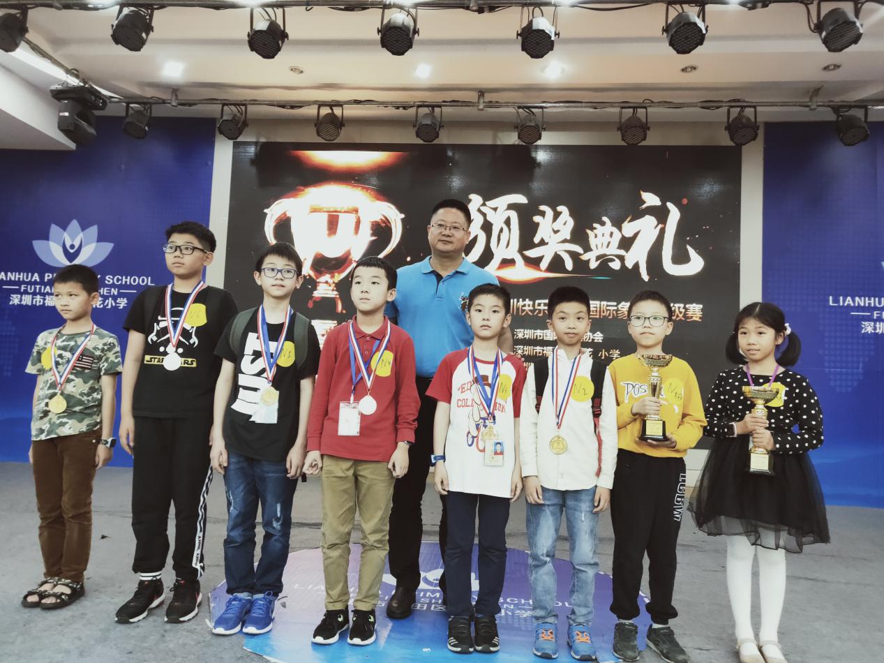 福田區(qū)蓮花小學(xué)校長(zhǎng)王華斌先生為獲獎(jiǎng)棋手頒獎(jiǎng)