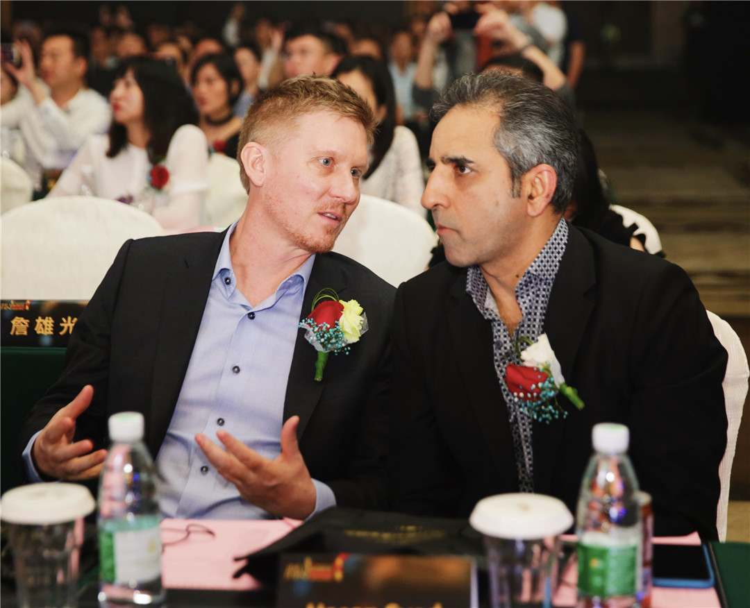 △中央美術(shù)學院建筑設(shè)計研究院院長、博士生導師王鐵,美國Gensler上海公司總監(jiān)Hasan Syed為廣州設(shè)計師黃永才頒發(fā)“最佳娛樂空間設(shè)計獎”