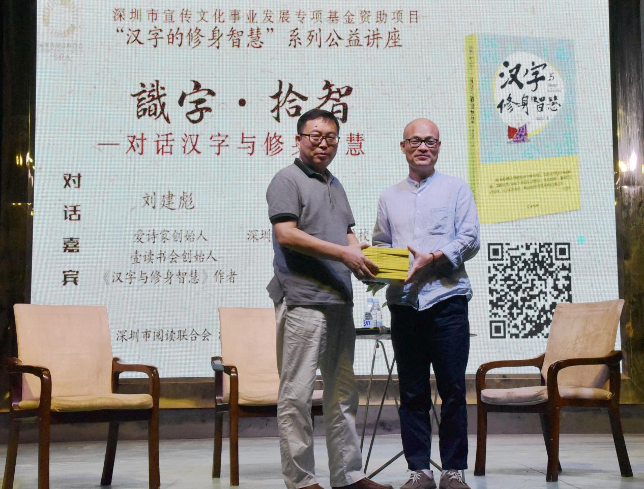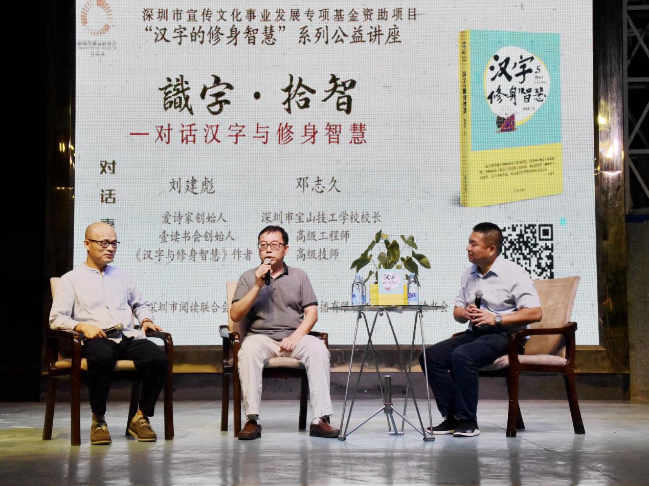 深圳新聞網(wǎng)訊 9月18日晚上7時,由深圳市閱讀聯(lián)合會、深圳市壹書文化傳播有限責(zé)任公司和寶山讀書會共同主辦的“‘識字拾智’——對話漢字與修身智慧”公益文化講座在寶山技工學(xué)校寶山大舞臺拉開了序幕。據(jù)悉,這是由深圳市宣傳文化事業(yè)發(fā)展專項基金資助項目“漢字的修身智慧”的第三場公益文化講座,以劉建彪《漢字與修身智慧》新書分享為契機(jī),傳播漢字正能量,讓更多的青少年識字長智,領(lǐng)略漢字文化之精妙。