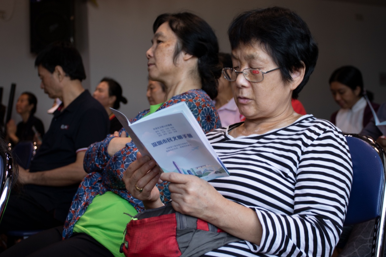 11月13日上午,本系列活動的第六場講座在龍聯(lián)社區(qū)工作站拉開了序幕。講座開始前,現(xiàn)場聽眾每人手上都拿到一本《深圳市民公約》小手冊和《漢字與修身智慧》學(xué)習(xí)資料,劉建彪老師首先跟大家互動:“我們需要什么樣的家園?文明城市從哪里開始?”“美麗、溫馨、文明、和諧的家園”,臺下一位叔叔的聲音尤其洪亮,劉老師及時肯定了他的回答。劉老師接著說,文明城市從人開始,人是建設(shè)文明城市的中堅力量,他進一步補充道,做文明人的第一步是轉(zhuǎn)變思想,只有了解并認同文明的重要性,才會自覺地踐行文明禮儀,積極參與城市文明的創(chuàng)建。