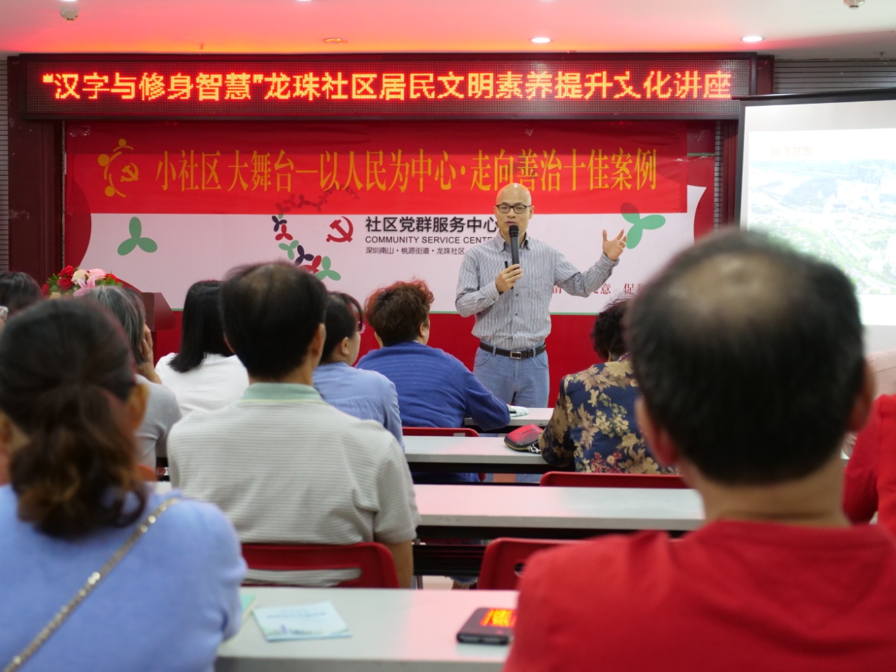 深圳新聞網(wǎng)訊 為更好地創(chuàng)建第六屆全國(guó)文明城市,以創(chuàng)新的活動(dòng)形式提升社區(qū)居民的文明素養(yǎng),11月15日上午,龍珠社區(qū)舉行了“‘漢字與修身智慧’社區(qū)居民文明素養(yǎng)提升”專題文化講座,邀請(qǐng)壹讀書會(huì)創(chuàng)始人、知名閱讀推廣人、《漢字與修身智慧》的作者劉建彪擔(dān)任主講嘉賓,從中華文明的基因(漢字)出發(fā),解讀深圳市民公約,旨在啟發(fā)居民在中華優(yōu)秀傳統(tǒng)文化的感召之下,踐行文明禮儀,用實(shí)際行動(dòng)去推進(jìn)文明城市的創(chuàng)建。