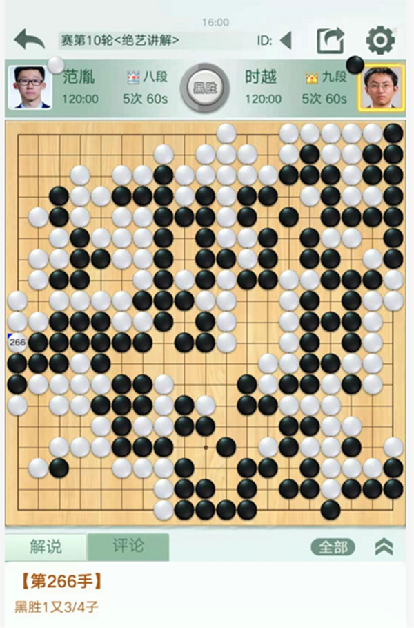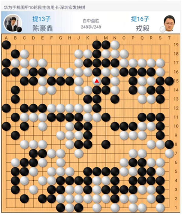 第一臺(tái),快棋,戎毅執(zhí)白勝陳豪鑫。黑棋開局在右邊以及中盤在左上的下法略嫌松緩,白領(lǐng)先。之后黑棋沖擊白棋中央致使左邊形成打劫,白棋簡(jiǎn)明處理后以較大優(yōu)勢(shì)進(jìn)入官子。最后黑棋為了強(qiáng)撐一目棋在自己空里出現(xiàn)打劫,在黑棋需要找很損的劫材時(shí)候黑方認(rèn)輸。
