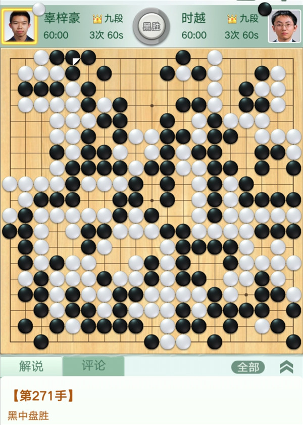 第四臺快棋,是兩位世界冠軍的對決,由深圳隊的時越九段執(zhí)黑快棋對陣江西隊的辜梓豪九段。開局至中盤雙方氣勢如虹,各自棄取,局面依然接近。之后黑棋下方定型失誤,白棋取得領先。在右下的劫爭中白棋判斷出現(xiàn)失誤,使黑棋扳回了局面。進入官子階段,黑棋不顧中央隱患搶占右邊官子,白棋如果抓住機會在中央黑空出棋形成劫爭則局面復雜。實戰(zhàn)白棋沒敢開劫而是繼續(xù)收官,黑棋補棋后穩(wěn)固了勝勢,時越執(zhí)黑中盤勝辜梓豪。