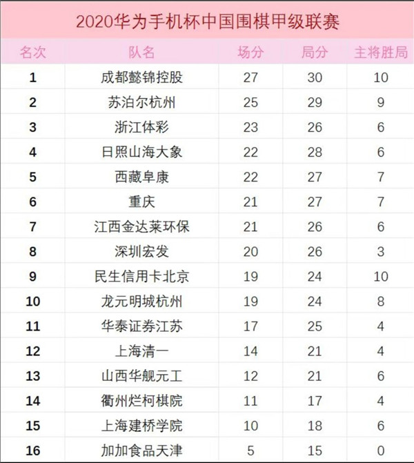本輪其它隊賽果如下:衢州爛柯棋院0:4負西藏阜康;成都懿錦控股3:1勝日照山海大象;上海清一隊3:1勝華泰證券江蘇;民生信用卡北京4:0勝天津加加食品;重慶1:3負蘇泊爾杭州;山西華艦元工4:0勝上海建橋?qū)W院;浙江體彩2:2主將負龍元明城杭。