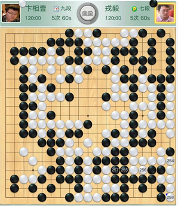 第二臺主將臺,由深圳隊戎毅七段執(zhí)黑對陣江西隊外援卞相壹九段。開局黑取實地白取外勢,局面接近。中盤黑棋在中央放棄出頭花兩手棋吃掉左下角白棋稍小,白棋棄角后圍住中央巨空,白稍好。官子階段白棋左上形狀處理有誤,黑棋未能抓住沖擊機會,選擇大幅退讓,最終目數(shù)不夠。戎毅執(zhí)黑負卞相壹。