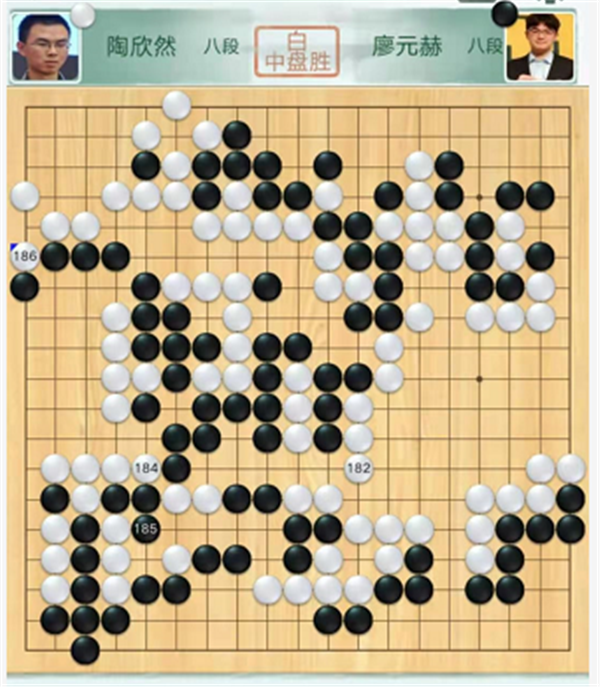 第四臺慢棋,由深圳隊陶欣然八段執(zhí)白對陣成都隊廖元赫八段。中央戰(zhàn)斗時候白棋選擇退讓,反倒形成打劫,黑棋劫勝后大幅領先。之后黑棋官子階段不夠冷靜細膩,幾處小虧損之后被白反超。黑棋看到局面危險更加沖動的選擇和白棋互相破空,結(jié)果又虧損導致差距越來越大。陶欣然執(zhí)白中盤勝廖元赫。