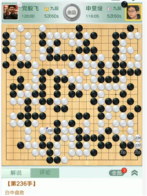 第一臺慢棋,由深圳隊的外援申旻埈九段執(zhí)黑對陣成都隊的世界冠軍黨毅飛九段。右下角白棋出現(xiàn)失誤,黑棋沒有抓住機會反而被白棋便宜不少。之后黑棋頑強追趕局面一度接近。但是官子階段黑棋始終沒有發(fā)現(xiàn)左上角官子便宜的小巧手,被白消除隱患后,白勝勢。申旻埈執(zhí)黑中盤負黨毅飛。