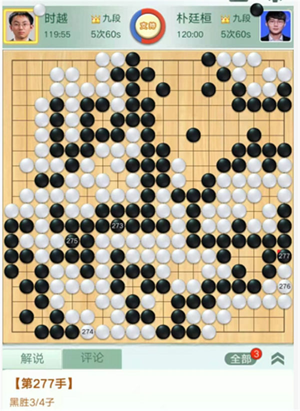 第二臺主將,由深圳隊時越九段執(zhí)白對陣成都隊韓國世界冠軍樸廷桓九段。開局下方雙方各有小失誤,局面均勢。之后左上黑棋行棋過分,白棋領先。白棋在黑右上角破空形成打劫,黑棋連走兩手分開右邊白棋進行攻擊。白棋治孤中錯失簡明獲勝的下法,但是活出后依然稍好。緊接著白棋沒有選擇最大的官子,被黑棋走到后黑棋領先。之后黑棋官子收束滴水不漏,以最小差距3/4獲勝。時越執(zhí)白3/4子負樸廷桓。