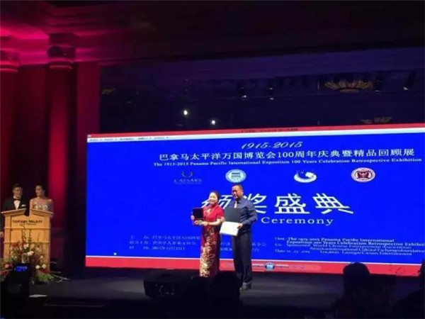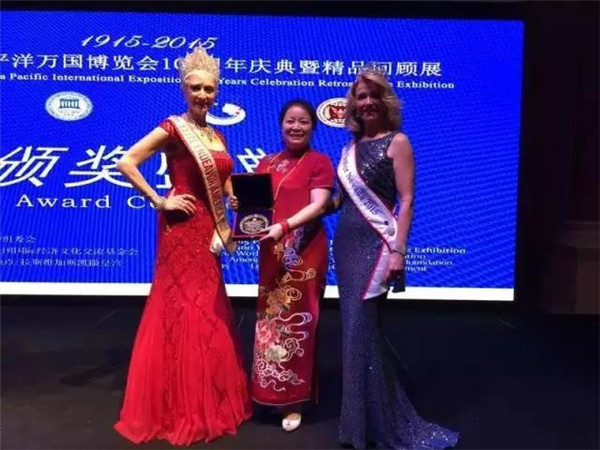 唐朝霞老師在萬國博覽會獲獎領獎的情形。