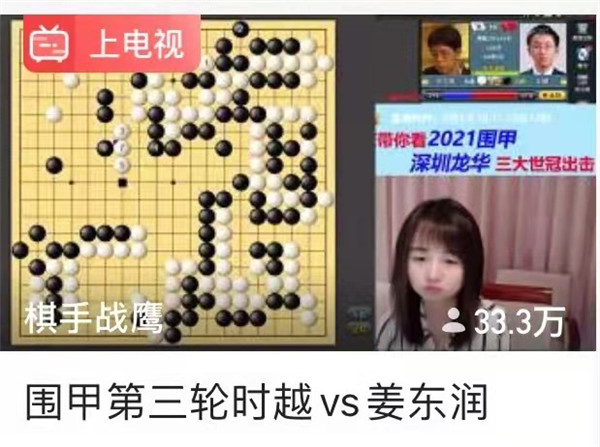 今日虎牙直播對深圳龍華隊的現(xiàn)場講解點評沖上了33.3萬人次的大關,人氣可謂一路上升!職業(yè)女棋手戰(zhàn)鷹解說生動有趣,棋迷們聽得也過癮。再有“龍哥”“申一冠”的迷粉,直播室熱鬧非凡!戰(zhàn)鷹是圍棋知名主播,作為深圳龍華隊網(wǎng)上直播合作人,為龍華隊的宣傳還真是帶來不小的效應!明天繼續(xù)吧。