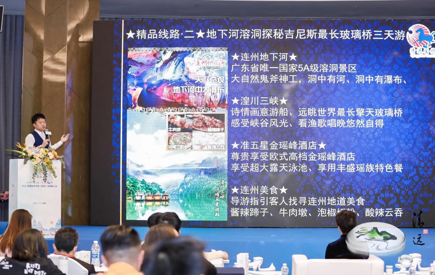 文化是旅游的靈魂,旅游是文化的載體。近年來,清遠依托自然資源稟賦和深厚的文化底蘊,多措并舉推動文旅融合發(fā)展,文旅產業(yè)呈現(xiàn)欣欣向榮局面?,F(xiàn)場,清遠市珠水美悅酒店管理有限公司總經理宋玉亮、清遠市古龍峽生態(tài)旅游娛樂有限公司營銷專員林嘉儀、清遠市愛地旅游發(fā)展有限公司營銷經理楊舒浩、清遠市國業(yè)旅游開發(fā)有限公司常務副總經理韓勇,依次以圖文并茂、聲畫結合的形式,推介了美林湖景區(qū),古龍峽景區(qū),連州地下河、湟川三峽、龍?zhí)犊蜅?、擎天玻璃橋、連州大酒店,峰林曉鎮(zhèn)、洞天仙境,讓與會人員身臨其境感受山水清遠的魅力;清遠市國旅國際旅行社有限責任公司業(yè)務總監(jiān)李國華則現(xiàn)場推介了古龍峽云天玻霸兩天游、地下河溶洞探秘及吉尼斯最長玻璃橋三天游等5條精品旅游線路,現(xiàn)場“種草”清遠眾多網紅打卡點。