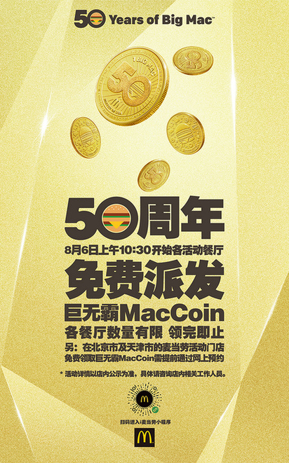 為了與中國消費(fèi)者一起歡慶巨無霸50周年,中國內(nèi)地指定麥當(dāng)勞餐廳將于2018年8月6日當(dāng)日免費(fèi)送出超過100萬枚MacCoin。早上10:30開始,顧客前往餐廳為巨無霸唱出生日歌[ 北京市和天津市的顧客需2018年8月4日上午9:00起在“i麥當(dāng)勞”微信小程序提前預(yù)約,方可于8月6日10:30起在指定麥當(dāng)勞餐廳領(lǐng)取。],即可獲得MacCoin一枚,圖案隨機(jī),送完即止。北京市和天津市的顧客需2018年8月4日上午9:00起在“i麥當(dāng)勞”微信小程序提前預(yù)約,方可于8月6日10:30起在指定麥當(dāng)勞餐廳領(lǐng)取。顧客可以分享與收藏,也可以在2018年12月31日前憑MacCoin在中國內(nèi)地、美國、荷蘭、新西蘭、巴西等全球超過50個國家和地區(qū)參與活動的麥當(dāng)勞餐廳,免費(fèi)兌換巨無霸一個。