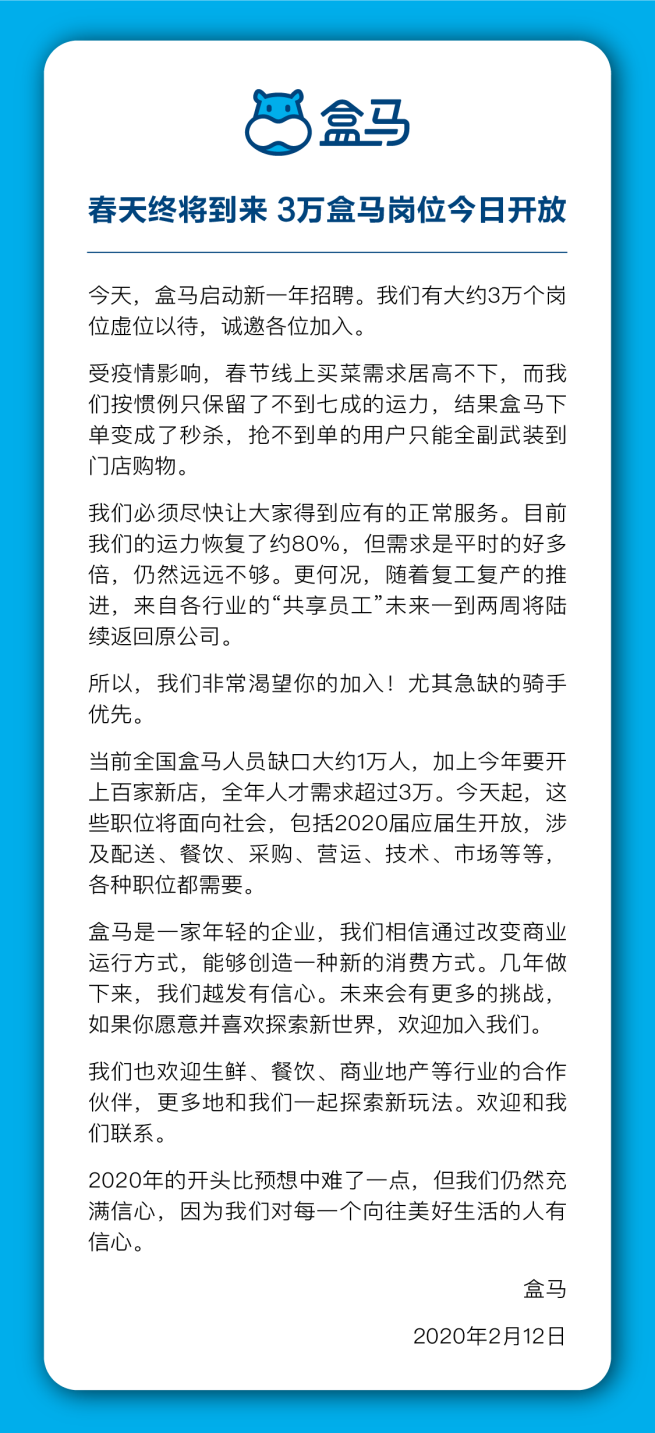 見(jiàn)圳客戶(hù)端·深圳新聞網(wǎng)2020年2月12日訊 2月12日,盒馬宣布開(kāi)啟新一輪招聘,開(kāi)放3萬(wàn)個(gè)崗位,包括總部采購(gòu)、技術(shù)、運(yùn)營(yíng)等,也包括一線門(mén)店小二,其中配送小哥最為緊急。