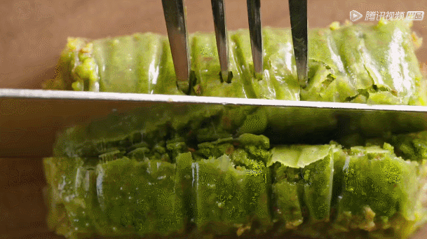 奶酪加滿滿的開心果碎,上下覆蓋二十層薄如蟬翼的面皮,小伙子苦苦練習七年搟面皮,十幾張面皮同時搟壓,每張的厚度不超過0.1毫米,