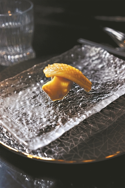 湯焯乃雞油焯響螺。1斤1只的響螺去殼與頭后,凈肉僅僅2兩。切成片狀的響螺經(jīng)過定時(shí)低溫慢煮后,淋上剛剛滾起的熱雞油,上碟時(shí),它旁邊跟著一灘其貌不揚(yáng)的醬汁,那便是紫蘇醬。響螺配紫蘇,勾起人們對中秋的紫蘇炒田螺的味覺記憶。油焯的風(fēng)味靈感源自蒜香骨這道傳統(tǒng)粵菜,取蒜香味結(jié)合魚露醬,融入花膠天婦羅之中。將花膠以天婦羅的方式展現(xiàn),這也是大膽的嘗試。味焯的做法則讓人更熟悉,立馬想起前些年風(fēng)靡廣州的鹵水火鍋來。獅頭鵝的鵝肝在鹵水里泡著溫泉,時(shí)間一到才起身,并不太咸,香濃恰好。還有汽焯,是用最當(dāng)造的大黃花魚,將整個(gè)迷你小蒸籠搬到面前來,現(xiàn)蒸現(xiàn)吃,7分鐘,嫩度正好?;痨虅t是燒烤澳大利亞和牛肉的燒烤方式,這最原始的烹飪方式里夾著迷迭香和百里香的誘人香氣。而這每一道菜肴,僅僅數(shù)口的分量,道道位上,分量恰到好處,避免了餐桌上的浪費(fèi)。