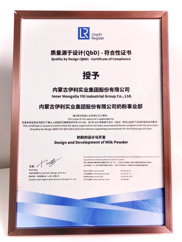 伊利獲頒食品行業(yè)首個(gè)QbD認(rèn)證