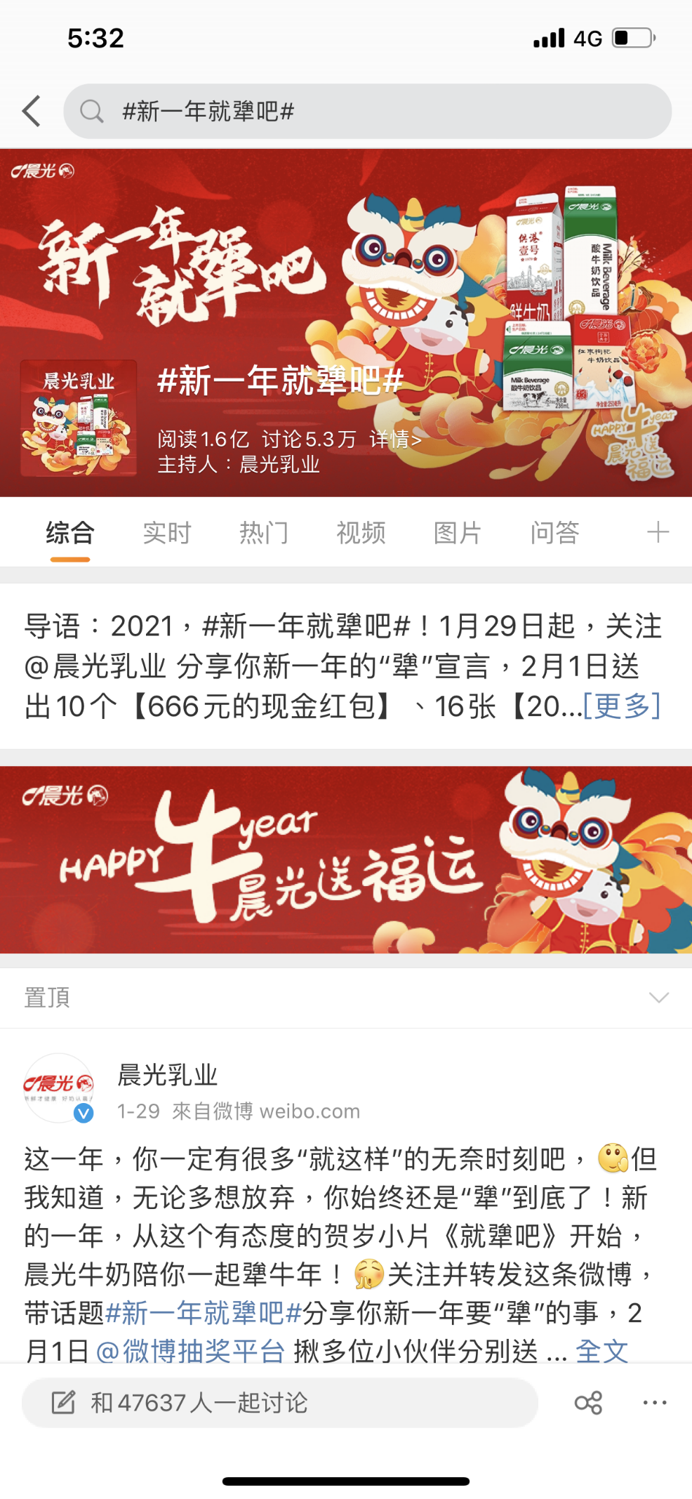 與此同時(shí),@晨光牛奶發(fā)起“犟到底”話(huà)題分享抽獎(jiǎng)活動(dòng),以“666元紅包”等“牛氣”獎(jiǎng)品刺激用戶(hù)參與話(huà)題討論。最終,話(huà)題 #新一年就犟吧#登陸微博熱搜榜第6位,僅兩日吸引1.5萬(wàn)人參與討論,話(huà)題閱讀量突破1.6億。