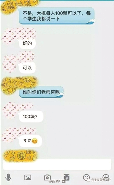 在被曝光的聊天記錄中,該老師曾表示,“大概每人100就可以了,每個(gè)學(xué)生我都說一下?!辈⒔忉屨f,“誰(shuí)叫你們老師窮呢?”聊天記錄顯示,群內(nèi)多名學(xué)生回復(fù)稱,“可以。”