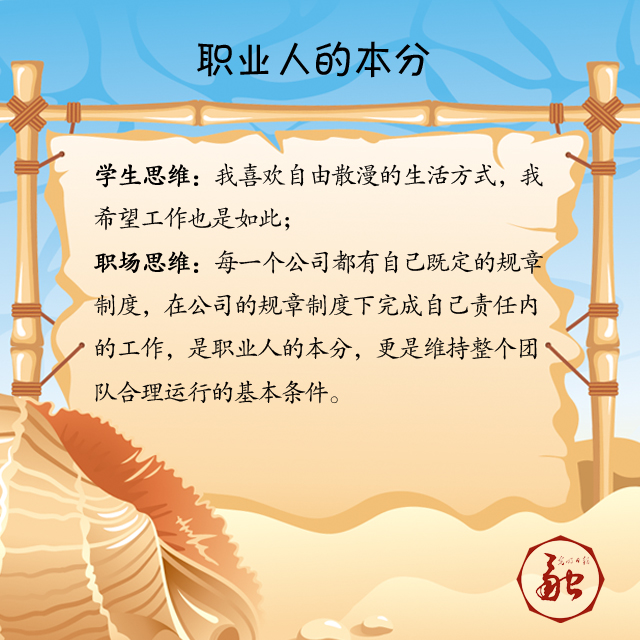 職場思維:每一個公司都有自己既定的規(guī)章制度,在公司的規(guī)章制度下完成自己責任內(nèi)的工作,是職業(yè)人的本分,更是維持整個團隊合理運行的基本條件。