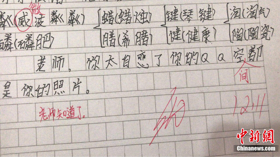 近日,貴州省谷隴翁板小學(xué)的語文老師張沁文,曬出了學(xué)生寫在作業(yè)里的“金句”。“老師,你太自戀了,QQ空間都是自己照片”;“顏值升高才有人喜歡您”……孩子們的童言無忌令人哭笑不得,老師的評論也很亮眼。