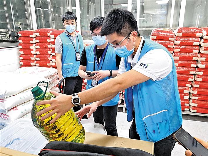 工作人員在學(xué)校食堂倉(cāng)庫(kù)進(jìn)行食品原材料抽檢。