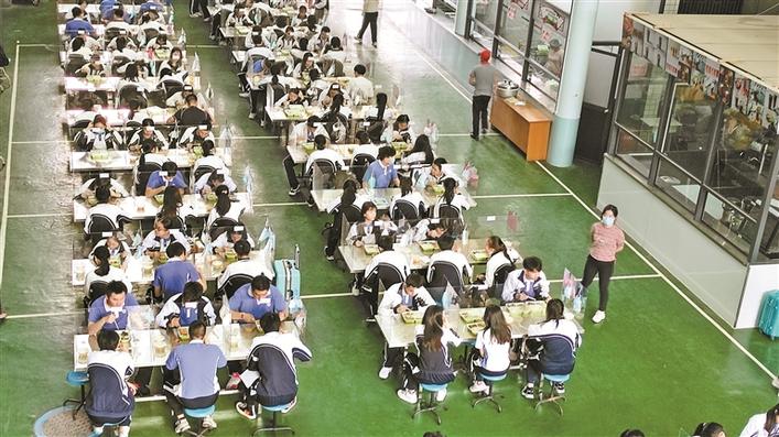 ▲4月27日,高三初三學(xué)生返校復(fù)學(xué)首日,梅林中學(xué)學(xué)生在飯?zhí)糜貌?。飯?zhí)妹總€座位都設(shè)有隔板。深圳晚報記者劉丹青攝