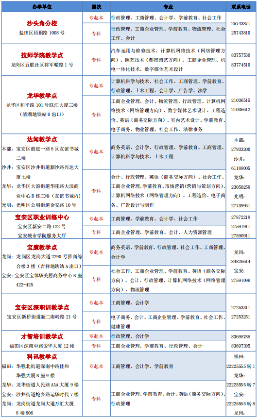深圳開放大學(xué)2021年春季招生教學(xué)點(diǎn)與專業(yè)公示