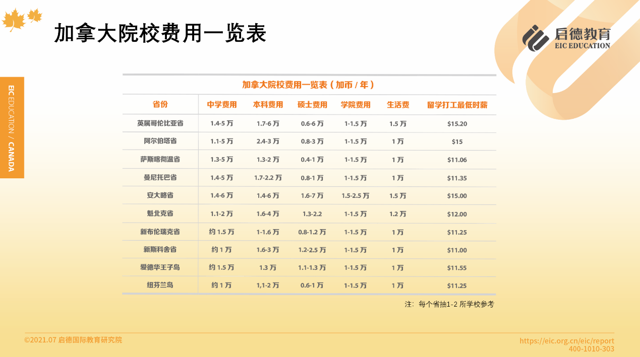 加拿大統(tǒng)計(jì)局?jǐn)?shù)據(jù)顯示,2019-2020學(xué)年加拿大國(guó)際留學(xué)生,本科平均學(xué)費(fèi)為29714加幣 /年 (同比上學(xué)年增漲7.6% ),約合16萬(wàn)人民幣/年;碩士平均學(xué)費(fèi)水平為17744加幣 /年(同比上學(xué)年增漲4% ),約合10萬(wàn)人民幣/年;生活費(fèi)1萬(wàn) -1.5萬(wàn)加幣 /年,約合5.2萬(wàn)-7.9萬(wàn)人民幣/年,總留學(xué)費(fèi)用在美、英、澳、加四大熱門(mén)留學(xué)目的國(guó)中最低。此外,加拿大公立中學(xué)學(xué)費(fèi)、生活費(fèi)用共約14萬(wàn)人民幣 /年,國(guó)際私立中學(xué)共約20萬(wàn)人民幣 /年,私立本地精英中學(xué)共約20萬(wàn)-28萬(wàn)人民幣/年,私立貴族中學(xué)共約26萬(wàn) -40萬(wàn)人民幣 /年。