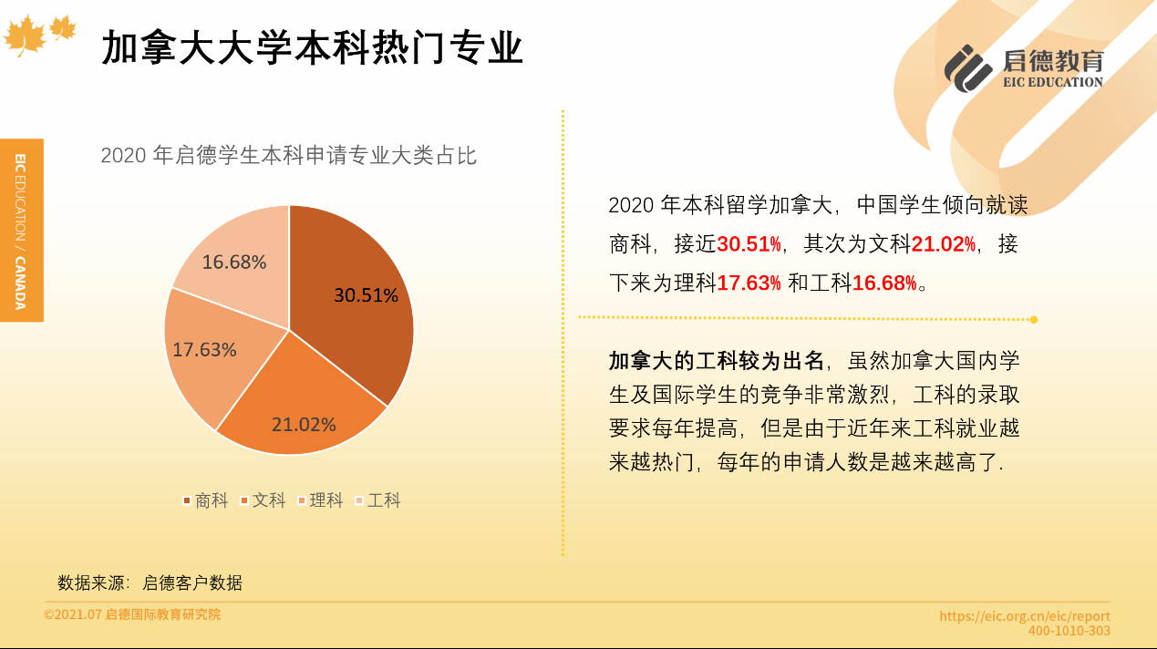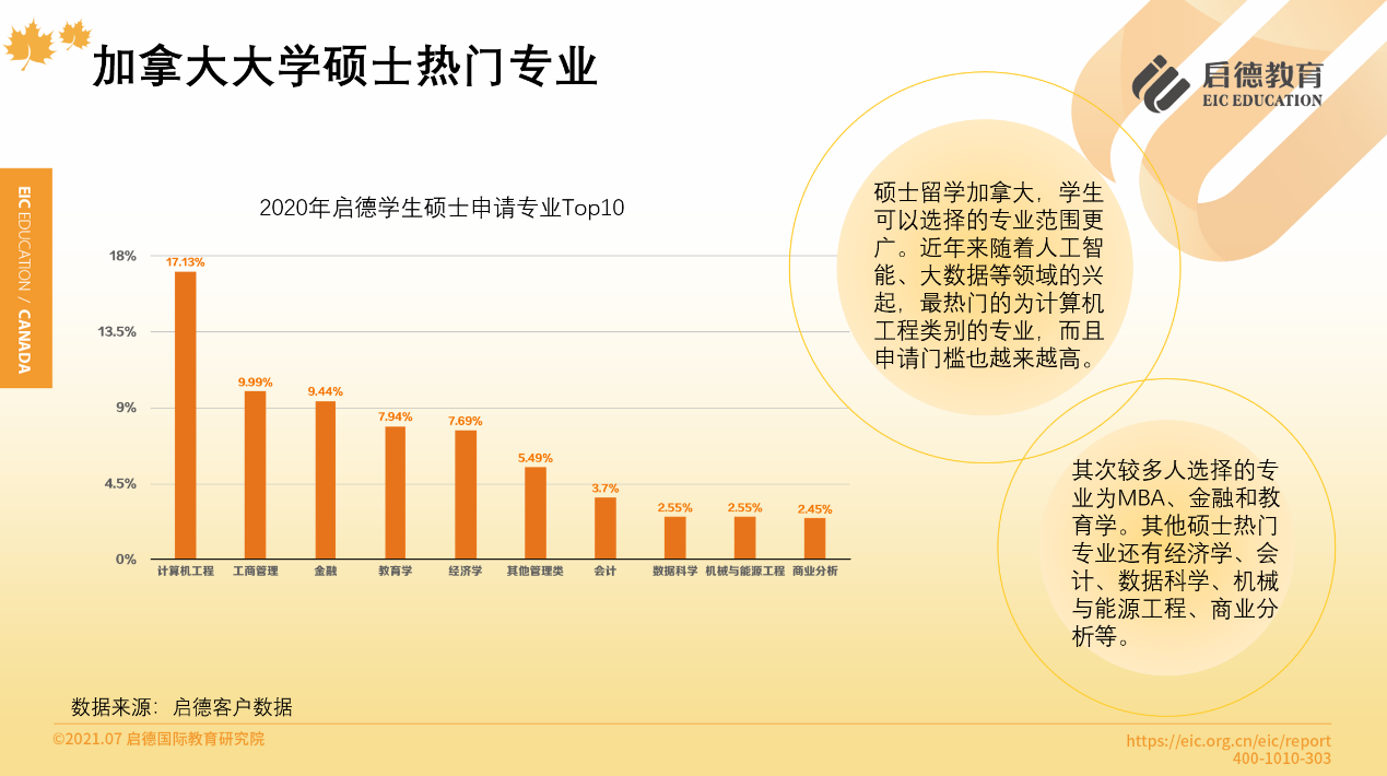啟德留學(xué)客戶(hù)服務(wù)數(shù)據(jù)顯示,2020年加拿大本科階段,理工科專(zhuān)業(yè)占比34.31%,商科占比30.51%,文科21.02%,理工科的申請(qǐng)人數(shù)超過(guò)了商科。碩士階段選擇最多的專(zhuān)業(yè)是計(jì)算機(jī)工程(17.13% )、 MBA (9.99% )、金融(9.44% )與教育學(xué)(7.94% ),其他碩士熱門(mén)專(zhuān)業(yè)還有經(jīng)濟(jì)學(xué)、會(huì)計(jì)、數(shù)據(jù)科學(xué)、機(jī)械與能源工程、商業(yè)分析等。