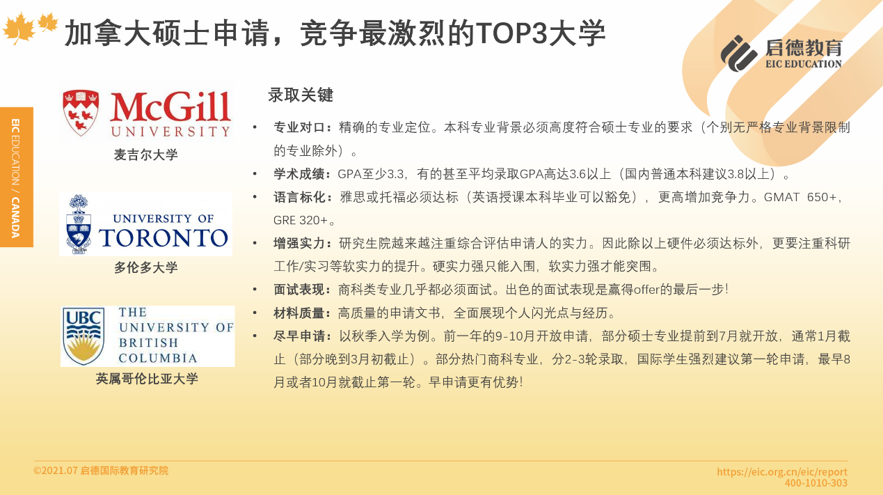 據(jù)啟德留學(xué)加拿大項(xiàng)目介紹,加拿大碩士申請(qǐng)競(jìng)爭(zhēng)最激烈的三所大學(xué)為麥吉爾大學(xué)、多倫多大學(xué)與英屬哥倫比亞大學(xué)。申請(qǐng)人 GPA至少達(dá)到3.3,有的甚至要求平均錄取 GPA高達(dá)3.6以上(國(guó)內(nèi)普通本科建議3.8以上);雅思或托福必須達(dá)標(biāo)(英語(yǔ)授課本科專(zhuān)業(yè)可以豁免), GMAT650+, GRE320+;除硬件必須達(dá)標(biāo)外,加拿大名校注重科研、工作 /實(shí)習(xí)等軟實(shí)力的提升;商科類(lèi)專(zhuān)業(yè)幾乎都必須面試。