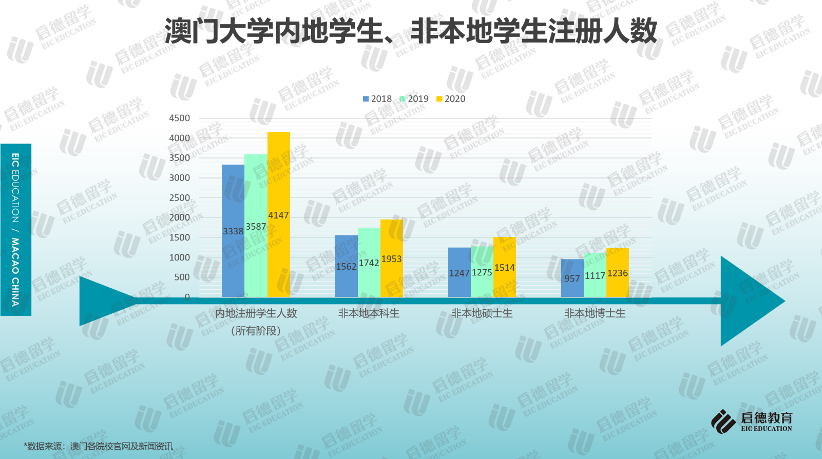 最近幾年,內(nèi)地學(xué)生赴澳門求學(xué)的人數(shù)保持增長,據(jù)澳門大學(xué)官網(wǎng)數(shù)據(jù)顯示,2020年,赴澳門大學(xué)求學(xué)的內(nèi)地注冊(cè)學(xué)生人數(shù)為4147人,相比2019年上漲了15.61%,相比2018年上漲了24.23%;2021/2022學(xué)年,澳門科技大學(xué)本科課程的內(nèi)地報(bào)名人數(shù)超過18000人,澳門城市大學(xué)本科課程的內(nèi)地報(bào)名人數(shù)接近13000人,計(jì)劃錄取866人,報(bào)錄比達(dá)到15:1。此外,2020年澳門大學(xué)本科(1953人)、碩士(1514人)、博士(1236人)階段的非本地生人數(shù)均呈穩(wěn)步上升,非本地學(xué)生包括來自中國內(nèi)地及其它國家與地區(qū)的學(xué)生。澳門高等院校的申請(qǐng)競(jìng)爭遠(yuǎn)比想象中激烈。