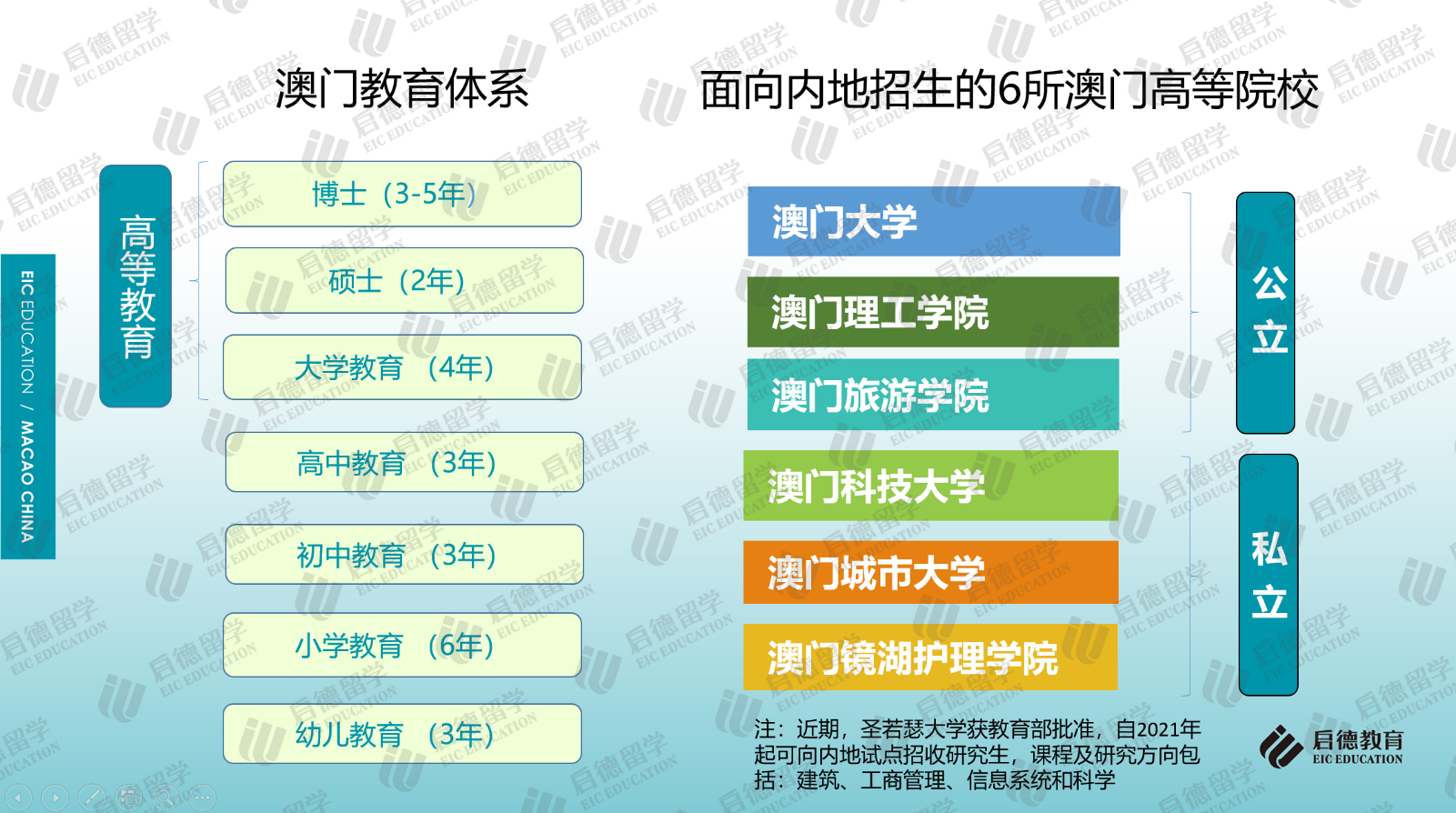 作為中西文化交匯的國際旅游城市,中國澳門的輕工業(yè)、旅游業(yè)、酒店業(yè)和娛樂場(chǎng)使其成為中外游客青睞的旅游度假勝地。澳門與香港同樣都具有獨(dú)特的地緣優(yōu)勢(shì),既有中國文化的根基,又融會(huì)貫通了歐美教育的優(yōu)勢(shì),中文、葡文、英文學(xué)制并存的多語言教學(xué)與多元文化交融的國際化環(huán)境,為學(xué)生提供了開闊的國際視野和學(xué)術(shù)氛圍,也為當(dāng)?shù)馗叩冉逃陌l(fā)展創(chuàng)造了良好的條件。目前,澳門大學(xué)、澳門理工學(xué)院、澳門旅游學(xué)院、澳門城市大學(xué)、澳門鏡湖護(hù)理學(xué)院、澳門科技大學(xué)等6所高校獲教育部批準(zhǔn)可面向內(nèi)地招收本科生及研究生,圣若瑟大學(xué)獲教育部批準(zhǔn)自2021年起可面向內(nèi)地試點(diǎn)招收研究生。