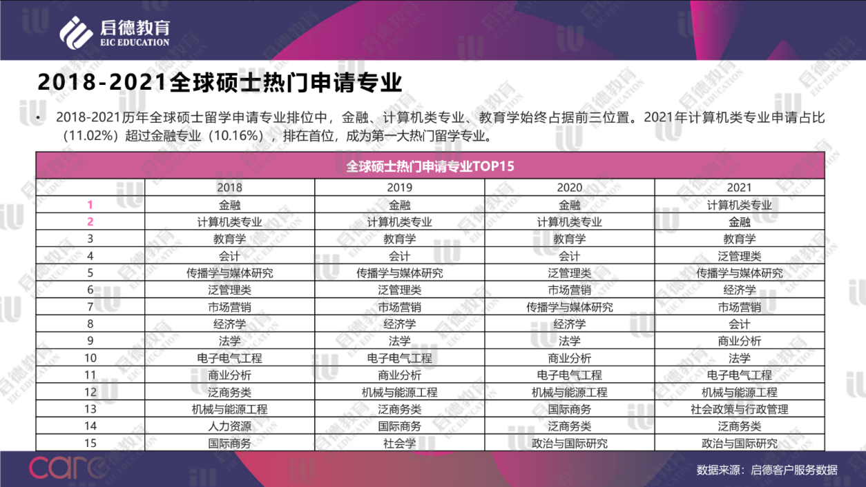 啟德留學(xué)客戶服務(wù)數(shù)據(jù)顯示,2018-2021歷年全球碩士留學(xué)申請專業(yè)排位中,金融、計算機類專業(yè)、教育學(xué)始終占據(jù)前三位置。2021年,計算機科學(xué)與信息系統(tǒng)(偏理科)、計算機科學(xué)與信息系統(tǒng)(偏工科)、電子與計算機工程、數(shù)據(jù)科學(xué)這四個計算機類專業(yè)的碩士申請占比合計為11.02%,超過金融專業(yè)(10.16%),成為第一大熱門留學(xué)專業(yè)。2021商科申請占比超過40%,理工科申請占比超過四分之一。其中,商科熱門碩士專業(yè)金融(10.16% )、經(jīng)濟學(xué)(4.63% )、市場營銷(4.43% )、會計(3.92% )、商業(yè)分析(2.99% )的申請占比為26.13%,理工科熱門碩士專業(yè)計算機(11.02% )、電子電氣工程(2.66% )、機械與能源工程(2.15% )的申請占比為15.83%。
