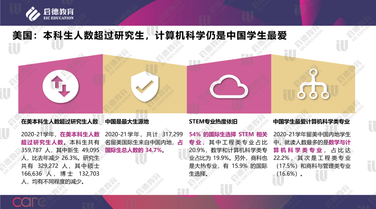 據(jù)2021 《美國門戶開放報告》數(shù)據(jù)顯示,2020/21學(xué)年共有914,095名國際學(xué)生在美國高等教育機構(gòu)學(xué)習(xí),中國內(nèi)地(317,299人)依舊是美國最大的生源地區(qū),在國際學(xué)生中占比為34.7%,其中本研占比分別是39.6%與37.5%。