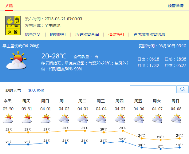 根據(jù)市氣象局發(fā)布消息,本周末到下周初溫暖舒適,無(wú)明顯降雨:30日至4月4日多云間晴天,早晚有輕霧,空氣較干燥,30日氣溫20-28℃。