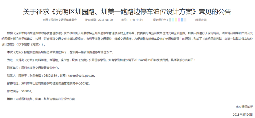 據(jù)介紹,根據(jù)《深圳市機(jī)動車道路臨時停放管理辦法》,按照“符合道路交通安全法律法規(guī)規(guī)定,有利于道路交通調(diào)控、緩解交通擁堵,方便道路臨時停車設(shè)施的使用和管理”的原則,交通部門制定了《光明新區(qū)圳園路、圳美一路路邊停車泊位設(shè)計方案》,擬在圳園路新增路邊停車泊位16個,在圳美一路新增路邊停車泊位27個。