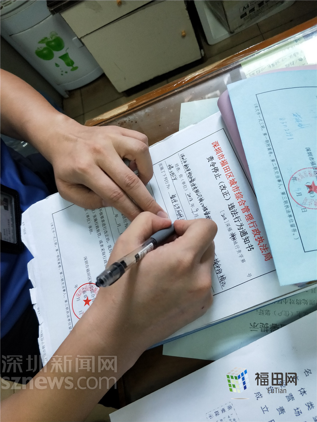 福田街道執(zhí)法隊(duì)給購(gòu)物公園管理處開具責(zé)令停止(改正)違法行為通知書。