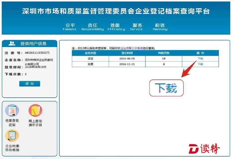 驗證成功后,電腦顯示進入查詢頁面,顯示與登錄人有關(guān)的企業(yè)名稱。點擊要查詢檔案的企業(yè)名稱,顯示列出“企業(yè)登記檔案”。