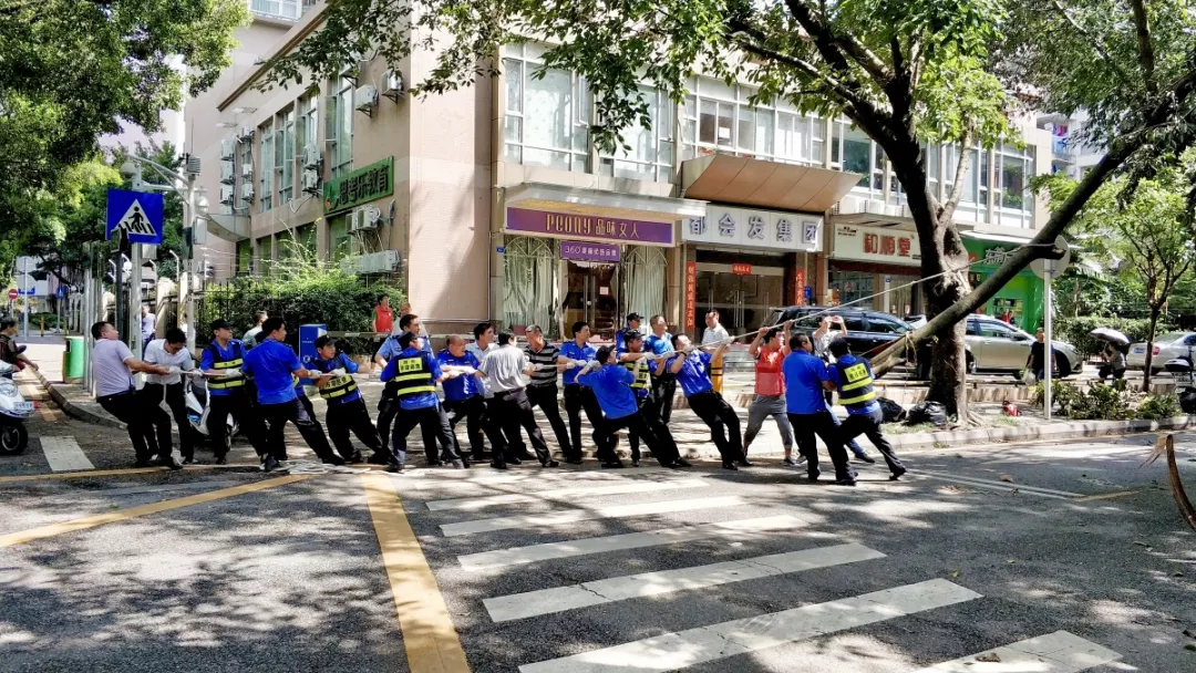9月19日上午,福田區(qū)百花二路、三路,60多名身著藍(lán)色制服的警察和紅色馬甲的輔警格外顯眼,他們正在揮汗如雨地進(jìn)行災(zāi)后路障清理工作。